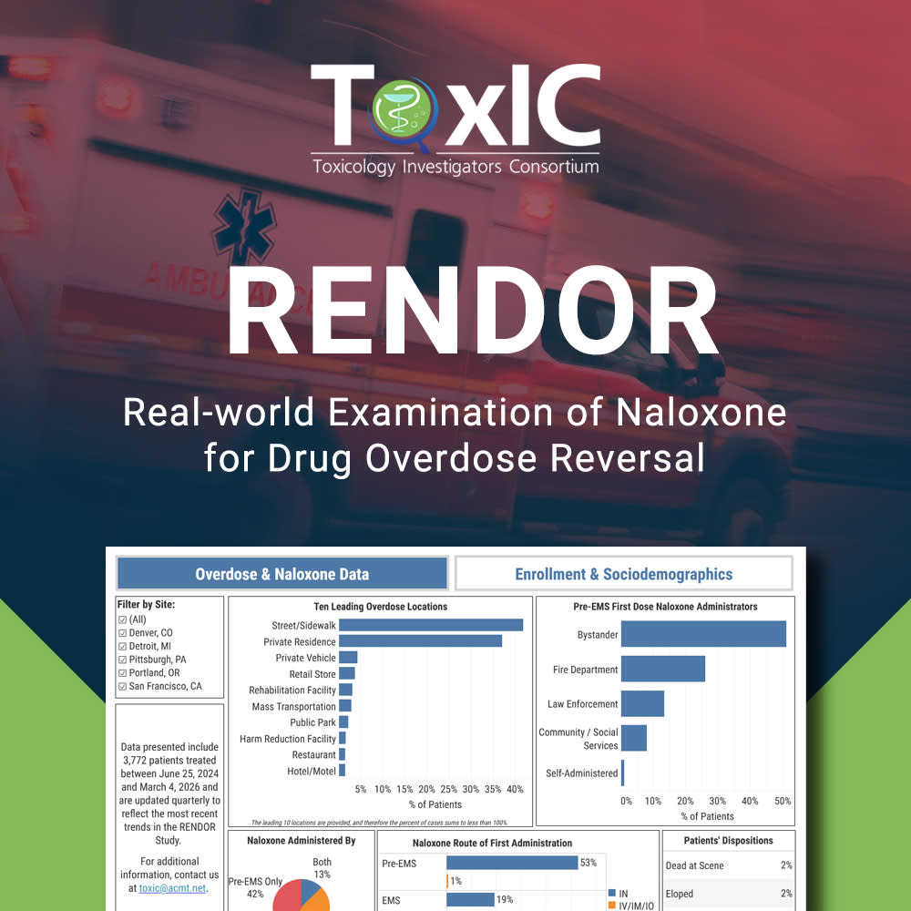 ToxIC has created a brand-new RENDOR project dashboard! RENDOR is a multi-center study looking at naloxone use, risks, benefits, and effectiveness for reversing opioid overdoses in pre-hospital settings.